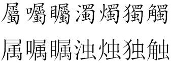 Here, all of the characters are identical except for the final two, whose radicals have been simplified. I have included a few characters with 屬 since the pronunciation of both components is the same. 屬 is actually made up of 尾 and 蜀. Let’s move onto the next image.
